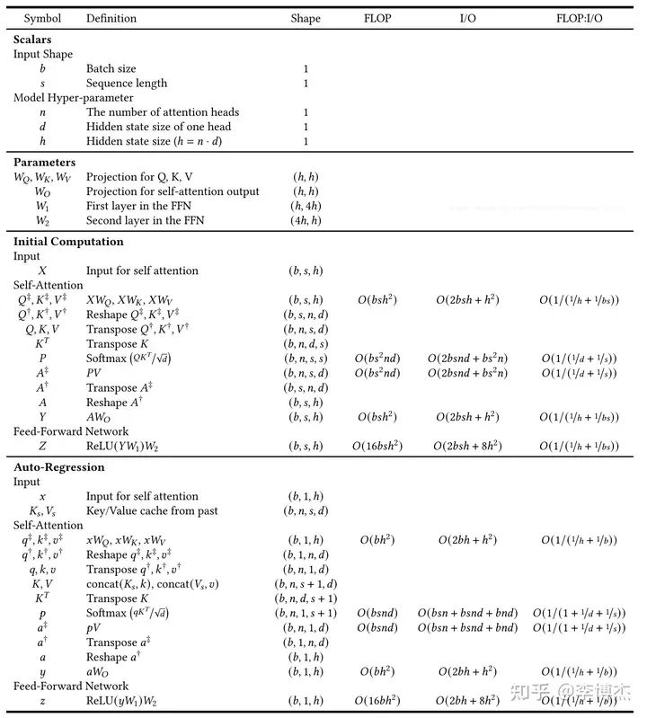 接下来我们就可以计算推理所需的计算量了。总的算力很好算,前面讲过,大概就是 2 * 输出 token 数量 * 参数数量 flops。如果想看细节,可以看下面这张图,来源是这里。