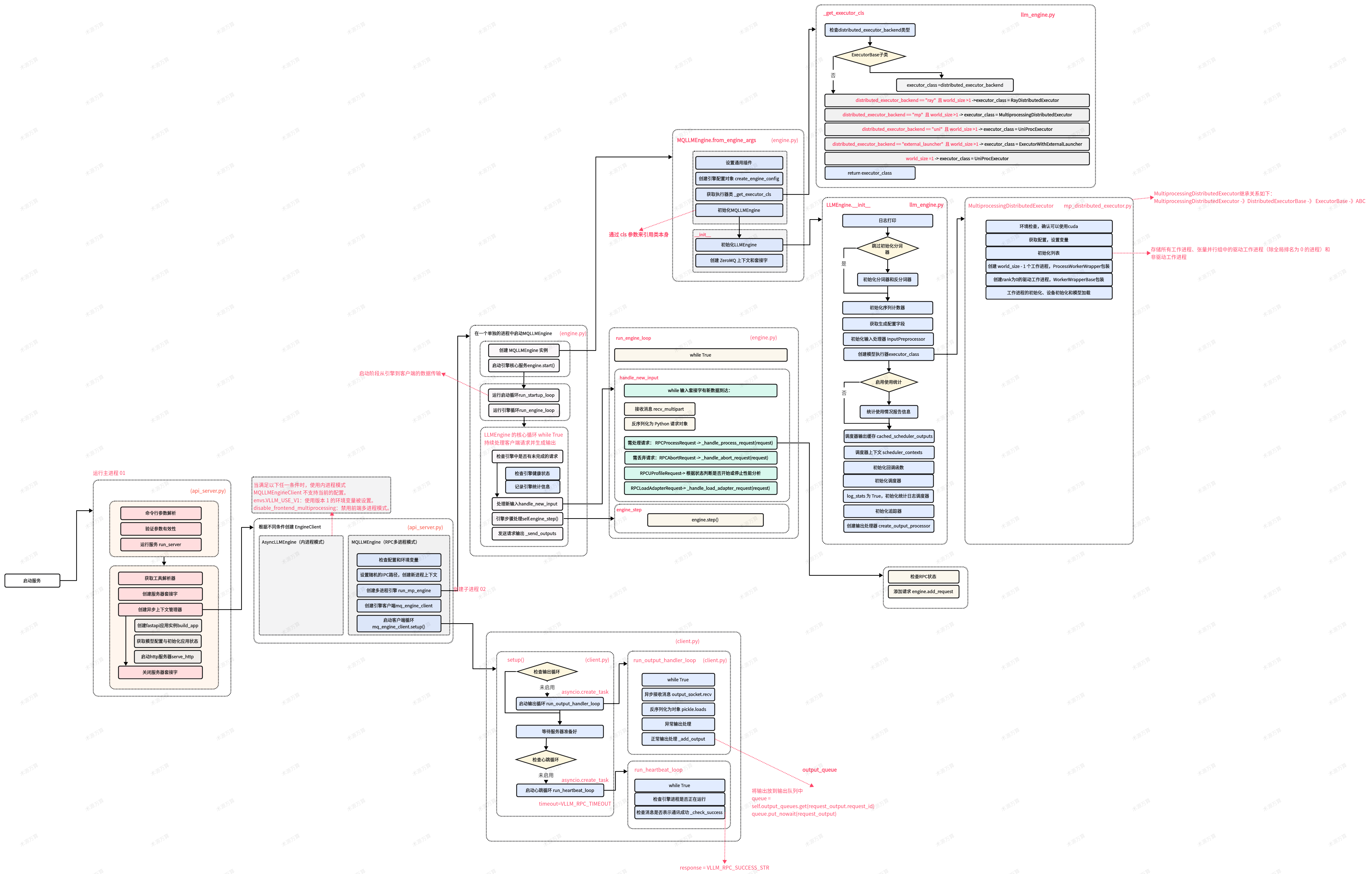 由上图可知,LLMEngine主要由两大部分组成:调度器(Centralized Controller)和分布式系统(Distributed Workers)。