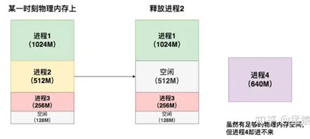 在这个情况下,如果要运行进程4,可以先把进程3从物理内存上交换(swap)到磁盘上,然后把进程4装进来,然后再把进程3从磁盘上加载回来。通过这种方法重新整合了碎片,让进程4能够运行。