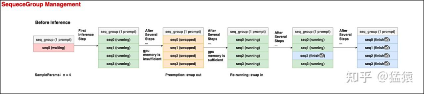 可能会出现“1个prompt à 多个outputs”的情况。所以,需要设计一种办法,对1个prompt下所有的outputs进行集中管理,来方便vLLM更好做推理。那么,SequenceGroup就能起到关键作用。