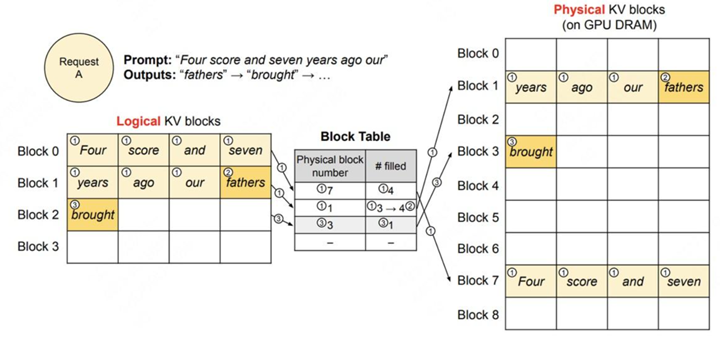5.1.1 单个请求假设向模型server发送一条请求,prompt为“Four score and seven years ago our”,要求模型能做续写。PagedAttention的运作流程如下图: