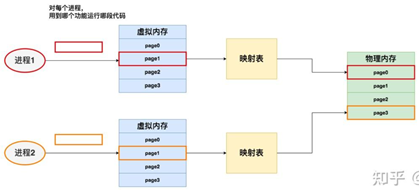 4.3 虚拟内存的分页管理 可以将进程1、进程2想成是两本书。代码分布在书的不同page上。想读哪一页,就加载哪一页,而不是一下把两本书都加载进来。同时,不想读某些页的时候,也能根据页码将其清空。