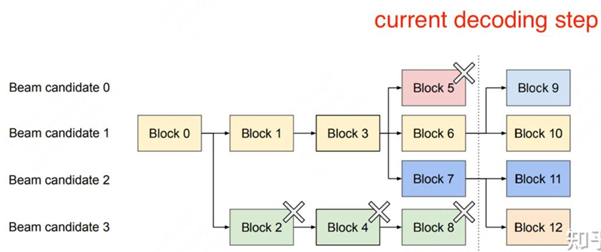 因此,根据最新时刻的beam search decoding结果,释放掉不再被需要的逻辑块和对应的物理内存空间,达到节省显存的目的。