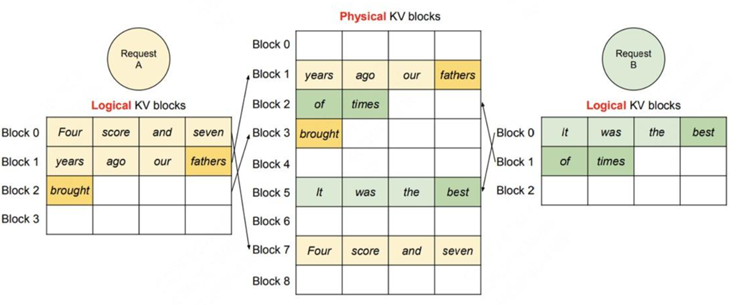 同时,引入PagedAttention算法允许键值对的非连续存储,通过将键值对划分成多个块并映射到物理块中,实现了键值对的共享和灵活的内存管理,有效避免了显存碎片化。