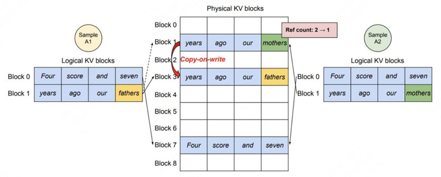 l 触发物理块copy-on-write机制:由于fathers/mothers是两个完全不同的token,因此对物理块block1触发复制机制,即在物理内存上新开辟一块空间。此时物理块block1只和A2的逻辑块block1映射,将其ref count减去1;物理块block3只和A1的逻辑块block1映射,将其ref count设为1。因此,vLLM节省KV cache显存的核心思想是,对于相同数据对应的KV cache,能复用则尽量复用;无法复用时,再考虑开辟新的物理空间。